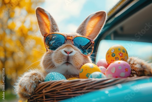 Easter bunny road trip adventure in a vintage car scenic countryside fun travel concept