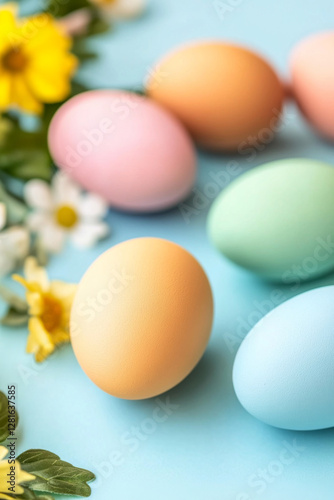 Easter eggs and cherry blossoms on pastel blue wood table background