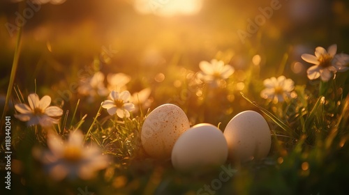 Easter eggs glowing under warm sunlight on a lush meadow, evoking themes of rebirth and seasonal celebration.