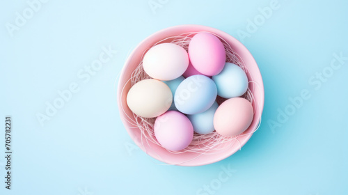 Easter eggs in pastel blue and pink colors, in a pink bowl on a blue background
