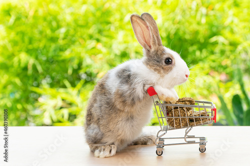 Easter holiday bunny animal and shopping online concept. Adorable baby rabbit white and brown pushing red shopping basket cart with cookie carrot while standing over green nature background.