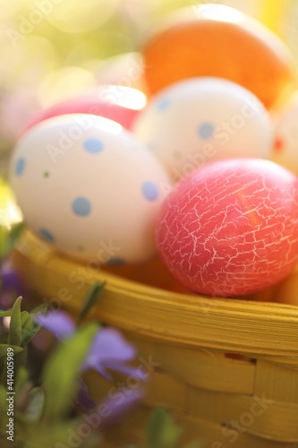 easter, holiday, egg, yellow, basket, purple, spring, flower, blurred, garden, morning, sun, festive, religious, symbol, religious holiday, colourful, decoration, celebration, season, coloured, easter egg, seasonal, traditional, tradition, grass, green, colours, food