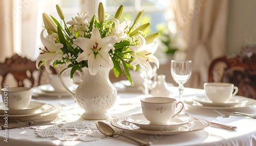 Easter lily bouquet in porcelain pitcher, lace doilies underneath, antique silverware gleaming, traditional brunch table setting with natural lighting