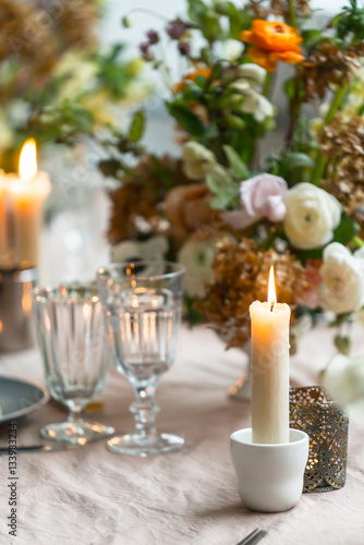 easter, table, food, meal, glasses, flower, spring, ranunculus, hydrangea, vase, pink, rose, napkin, bouquet, candle, wine, brown, anemone, leaf, holiday, decor, decoration, season
