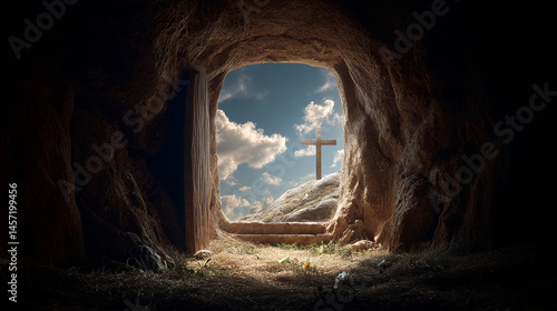 Easter, the tomb of Jesus with an open stone door and a cross on top of it, a beautiful sky with clouds in pastel colors behind it