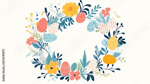 Easter wreath floral frame, colorful eggs, bunnies, spring flowers, blank space in center for message or photo, use for greeting cards, invitations, or prints