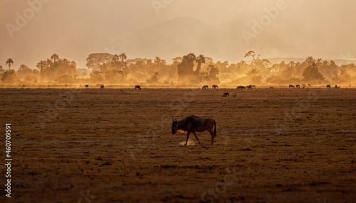 wildlife, gnu, white, ungulate, tropical, tanzania, sunset, sunrise, scenery, savanna, safari, ruminant, resting, outdoors, nature, mammal, mammal, kenya, horn, horned, horn, herd, herbivore, group, grey, grazing, grey, grass, gnu, female, eastern, dusty, dust, brindle, bovidae, blue, bearded, antelope, antelope, animal, african