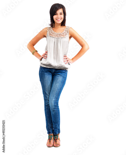 jean, white, woman, young, isolated, confident, copy space, female, white background, authentic, eastern european, expression, beauty, people, woman, studio, portrait, fashion, beautiful, happy, background, model, adult, hand, cute, youth, smiling, standing, 1, smile, posing, 20s, attractive, brunette, person, feminine, casual attire, caucasian, pretty, pose, femininity, on white, lovely, informal, full-length, happiness, front view, confidence