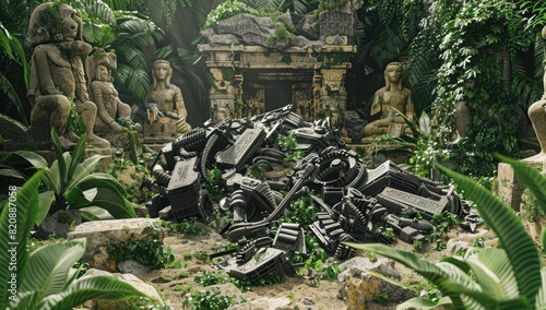 Echoes of the past resound through the Mayan ruins as an ancient mecha stands silent, a relic of a lost civilization.