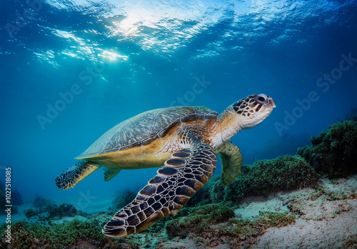 Echte Karettschildkröte (Eretmochelys imbricata) unter Wasser