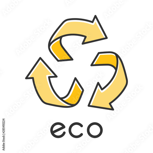Eco label color icon. Three yellow rounded arrow signs. Recycle symbol. Alternative energy. Environmental protection sticker. Eco friendly chemicals. Organic cosmetics. Isolated vector illustration