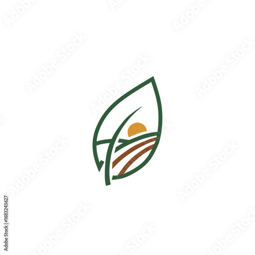 Eco Leaf logo with farm landscape and sunrise design