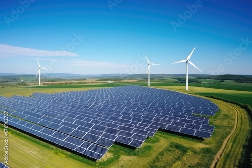 Eco Symphony: Aerial View of Windmills and Solar Panels Generating Clean Energy in the Countryside