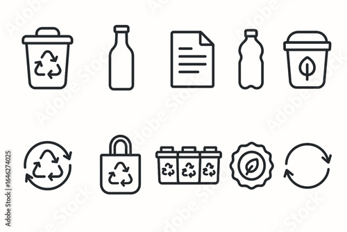 eco, waste, reusing, bin, glasses, bottle, paper, plastic, compost, arrow, recyclable, bag, sorting, badge, circular, economy, environment, green, nature, sustainable, organic, clean, planet, conservation, zero, footprint, ecology, protection, minimal, flat, icon, set, outline, curve, rounded, white, background, modern, digital, education, commercial, friendly, symbol, illustration