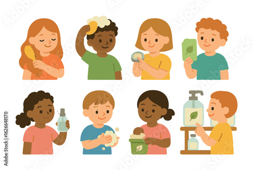 eco, friendly, beauty, icon, flat, vector, mini, illustration, sustainable, colours, children, brushing, hair, bamboo, brush, using, solid, shampoo, applying, balm, tin, holding
