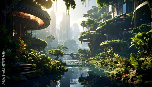city landscape, building, architecture, vegetation, river, water, plant, tree, foliage, green, modern, future, futuristic, urban, environment, nature, ecological, scenic, sky, daylight, sunlight, horizon, path, bridge, flower, leaf, growing, view, scene, garden, serene, peaceful, travel