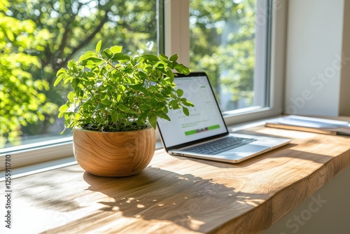 Ecofriendly gadget usage on a desk with indoor plants home office digital workspace natural light minimalist concept