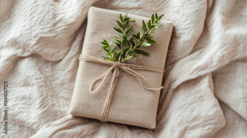 Eco-friendly gift wrapped in natural linen with greenery and twine on cozy fabric background