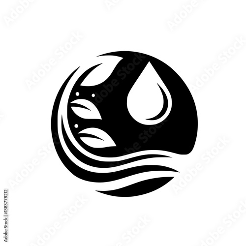 Eco-Friendly Logo: Leaves, Water Drop in Circle, Monochrome Design