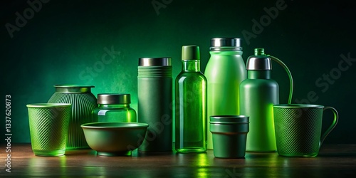 Eco-Friendly Reusable Containers: Green Gradient Bottles & Cups - Low Light Minimalist Illustration