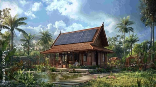 sustainable, eco, house, home, tropical, nature, green, modern, design, architecture, solar, energy, renewable, palm, tree, garden, duck pond, wood, rustic, peaceful, stylish, luxury, minimalist, charming, vacation, cabin, bungalow, bungalow, relaxation, living, space, exterior, view, landscape, beautiful, elegant, contemporary, environmentally friendly, solar panel, vacation home