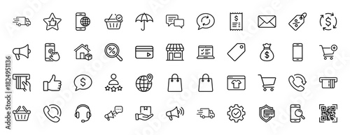 e-business, shopping, icon, vector, set, line, outline, delivery, payment, business, commerce, finance, retail, pictogram, illustration, collection, symbol, transaction, store, market, cyberspace, online, credit card, cash, money, checkout, client, communication, service, security, address, location, logistic, mobile, application, quality, feedback, return, exchange, global, purchase, minimal, scalable, monochrome, web
