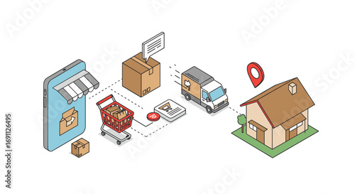isometric, delivery, e-business, mobile, shopping, package, cart, truck, house, location, online, order, digital, logistic, tracking, home, store, shipment, parcel, transportation, retail, commerce, technology, app, service, business, purchase, client, distribution, navigation, network, cyberspace, address, worldwide, connectivity, consumer, warehouse