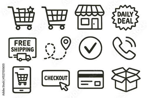 E-commerce icons: shopping, shipping, checkout, deals, navigation