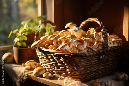 Edible mushrooms in a wicker basket on windowsill on a sunny morning indoors