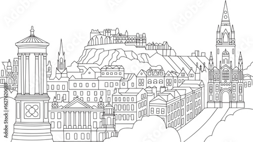 edinburgh, scotland, skyline, silhouette, vector, illustration, city landscape, city, town, urban, architecture, building, landmark, historical building, travel, tour tourism, culture, scottish, britain, britain, europa, european, outline, black, white, design, graphic, icon, symbol, art, drawing, clip art, image, historical, sightseeing, destination, trip, vacation, holiday, journey, earth, country, nation, geographic, location