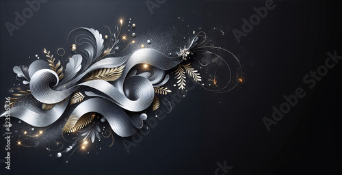 Edler, abstrakter Hintergrund mit silbernen, leuchtenden Linien und Ornamenten auf schwarzem Hintergrund