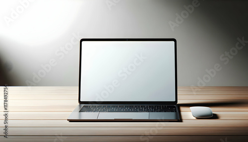 Education A diagonal view of a laptop with a blank white screen on a desk, against a plain background The lapt4