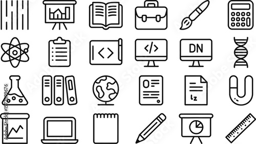 education, science, icon, vector, set, learning, research, symbol, school, university, online, course, atom, deoxyribonucleic acid, globe, clipboard, book, calculating machine, crayons, ruler, magnet, notebook, computer, browser, code, flask, file, presentation, briefcase, paintbrush, document, chart, laptop, study, cognition, academic, scientific, technology, business, report, cv, training, tutorial, development, programming, design, datum, analysis, art