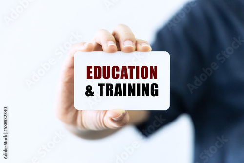 Education and training text on blank business card being held by a woman's hand with blurred background. Business concept about education.