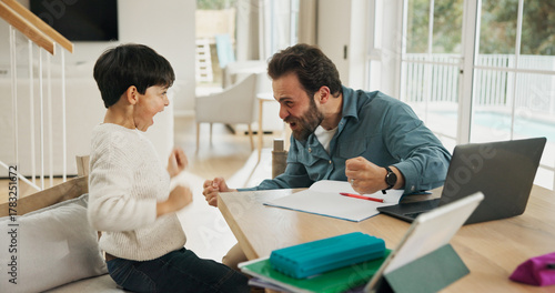 Education, fist pump or success with father and son in home living room for celebration or study. Learning, motivation or technology with boy child and single parent man in apartment for homework