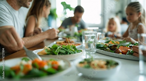 Educators eating dinner with family at home, beautifully styled table, vibrant colors, editorial layout, cozy home setting, Magazine Photography style