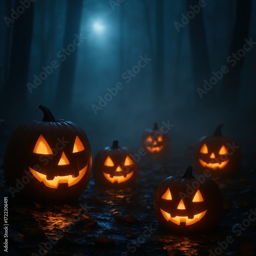 Eerie carved jack o lantern pumpkins casting warm glow in a misty midnight forest with swirling fog and moody blue moonlight atmospheric spooky scene