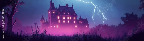 Eerie castle lit by a thunderstorm, flat design, top view, supernatural theme, animation, colored pastel