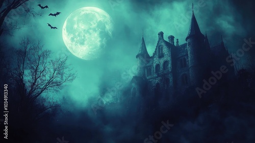 Eerie Gothic castle illuminated by the full moon at night Sinister old house with bats adds to the creepy atmosphere perfect for a Halloween horror theme Chilling scene of darkness and mystery
