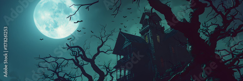 Eerie Haunted House Silhouette Under Moonlit Sky with Twisted Trees and Flying Bats