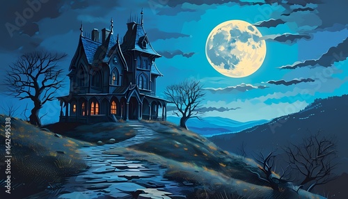 Eerie night scene haunted house spooky landscape digital art moonlit environment dark fantasy concept
