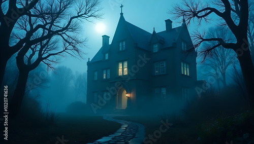 haunted, house, full moon, darkness, eerie, gothic, mystery, shadow, skittish, ghostly, architecture, tree, forest, mist, creepy, lantern, victorian, night, path, chilling, silhouette, fog, luxury home, gable, porch, sinister, twilight, atmosphere, legend, horror, supernatural, whisper, flickering, abandoned, secluded, chill, ominous, spectral, aura