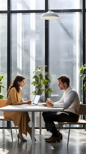 communication, office, modern, technology, laptop, desk, discussion, collaboration, minimalist, window, contemporary, work, business, professional, corporate, co-worker, meeting, brainstorming, teamwork, digital, wireless technology, efficiency, productivity, strategy, connectivity, information, professionalism, workplace, diary, data processing, interpersonal, natural light, business meeting