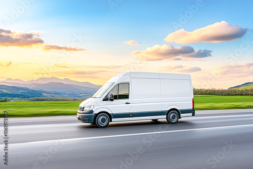 Efficient delivery on the move a white van traveling through scenic landscape at sunset