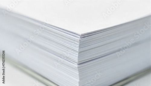Efficient Office Organization A hyperrealistic, top down view of a polished wooden desk surface. A precisely stacked pile of crisp white documents lies on the left. To the right, a closed, leather