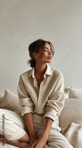 Effortless light play, modern weightlessness, serene woman portrait wearing beige clothes