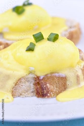egg, benedict, eggs benedict, poached, bread, breakfast, chives, toast, toasted, sauce, up close, vertical, chopped, crust, epicure, food, macro, meal, onion, plate, white, yellow, background, blue, gold, green