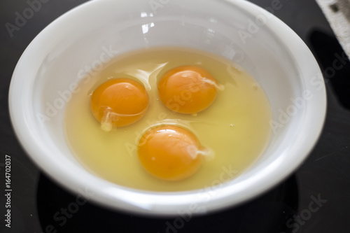 Eggs in white bowl close up top view