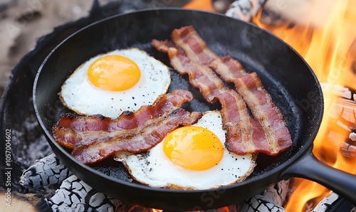 eggs sizzle alongside crispy bacon in a black skillet on a blazing campfire, Generative AI