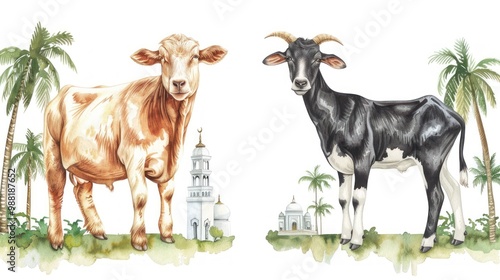 cow, goat, animal, sacrifice, religious, muslim, islam, eid, holiday, celebration, tradition, faith, culture, spiritual, belief, prayer, mosque, dome, minaret, islamic, sheep, animal, illustration, watercolor, art, painting, digital, graphic, design, festive, joyful, holy, sacred, peace, kindness, sharing, giving, blessing, gratitude, palm, tree, tropical, green, white, brown, black